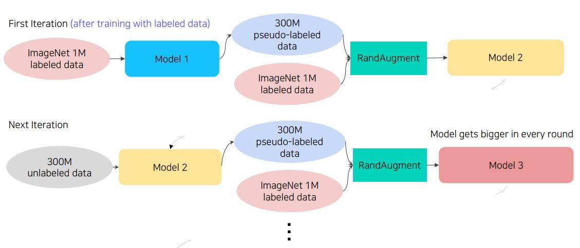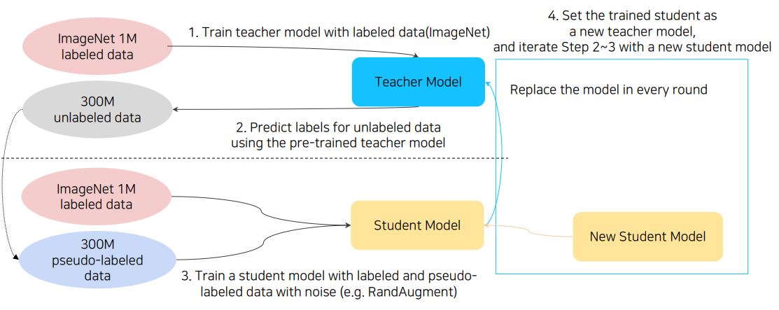 - 기존의 Teacher Model이 Student Model보다 항상 큰 모델이였지만, Self-training에서는 Student Model이 루프마다 더 큰 모델 학습되어 Teacher Model로 다시 대체된다.