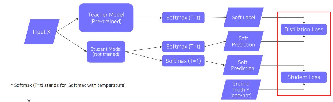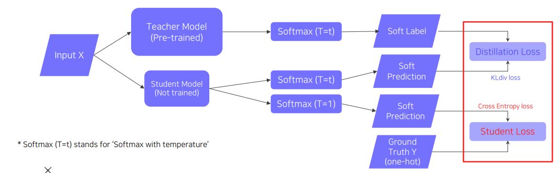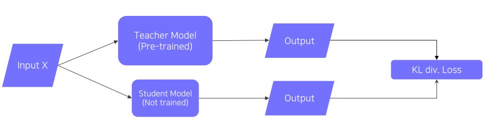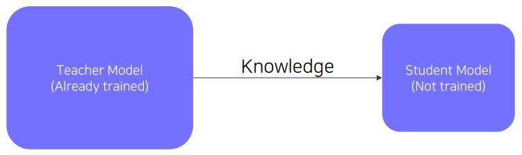 - Pre-trained된 Teacher Model의 지식을 Student Model에 주입하여 학습 (큰 모델 -> 작은 모델)